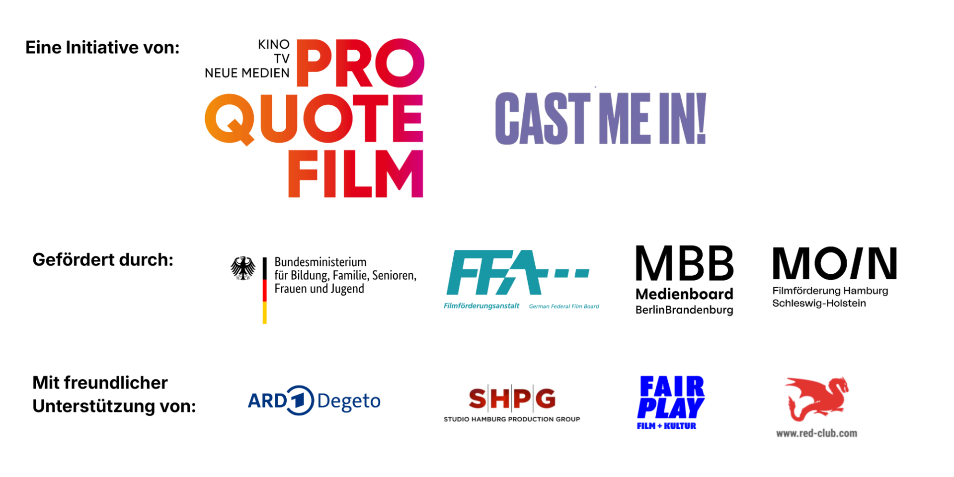 Quote Ost · Let’s Change the Picture · Schwarze Filmschaffende e. V. · Muslim Futures · Roma Trial e. V. · Minderheitensekretariat der vier autochthonen Minderheiten und Volksgruppen · Kinoblindgänger gGmbH · Rollenfang · ZfK / Trube Stiftung · Vielfalt im Film e. V.